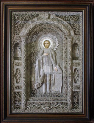 The details of the pattern on the saints’ clothing are created entirely from linen thread. Every knot is tied by hand, and imbued with warmth and love by the master himself. The material for the icons is also not accidental, according to Denschikov. For him, linen, being the most simple, clean, affordance, and durable material, is associated with Orthodoxy.