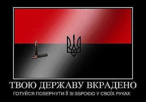 The demotivator, with the official red-black flag of the OUN and a trident as its background, depicts two bullets.