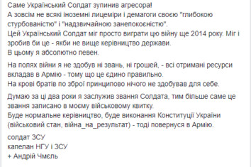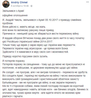 Chmel complains that he was defeated as a priest: "neither the political, military, nor church leadership listened to me about this war," he says, and stresses, "Our victory was stolen from us."