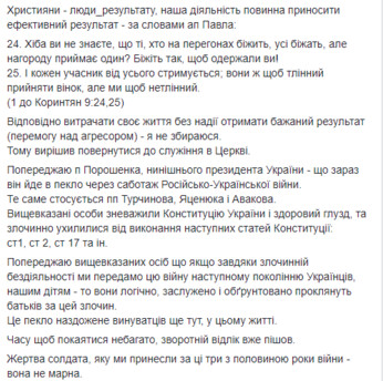 "I warn the above-mentioned persons that if, due to the crime of omission, we pass this war on to the next generation of Ukrainians, our children – they will logically, rightly and reasonably curse parents for this crime. This hell will catch up with the perpetrators here, in this life. There is just a little time left to repent: the countdown is already on," added the "cleric".