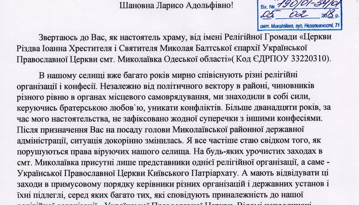 The UOC religious community of the Church of the Nativity of John the Baptist and St. Nicholas in Nikolaevka, Odessa region, published an appeal to the Head of the State Administration Larissa Vysotskaya with a demand to stop pressure on believers to transfer to the Kyiv Patriarchate. The document is published on the website of the Baltic eparchy of the UOC.