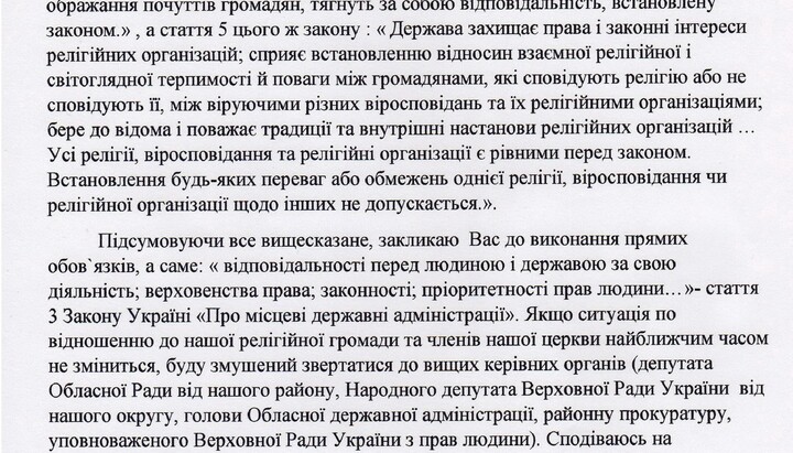 "I increasingly witness violations of the rights of believers in our village. At solemn events in the urban settlement of Nikolaevka, you can see the presence of only one religious organization – the Ukrainian Orthodox Church of the Kyiv Patriarchate. There are facts when you summoned to your office, and under the pressure of your position indicated which Church people should go to and how to pray," the clergyman writes.
