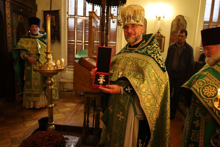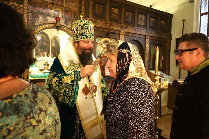 After the Liturgy, a moleben was served before the icon of St. Sergius. Met. Nicholas addressed the faithful, encouraging them to emulate the saint’s virtues, and presented Bsp. Kliment with a panagia as a memento of their first meeting in the Holy Land. He also congratulated Protodeacon Serge Arlievsky and cathedral warden Sergei Yakushin on their namesday.